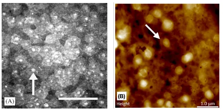Figura 1: Imagem de córnea humana com (A) microscópio confocal e (B) imagem obtida por AFM do epitélio de córnea. Imagem (A) retirada de: T. Tervo, J. Moilanen / Progress in Retinal and Eye Research 22 (2003) 339– 358.